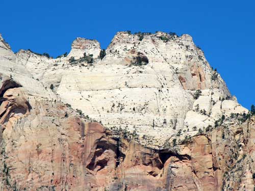 The very top of the West Temple is composed of the Temple Cap Formation. Below that is Navajo Sandstone. The different colored streaks down the cliff face are the result of seasonal rains and waterfalls.