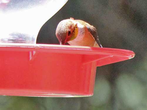 Apparently there are three types of hummingbirds that frequent the area: broad-tailed (green with a pink throat), rufous (orange) and black-chinned (black head with a purple throat).