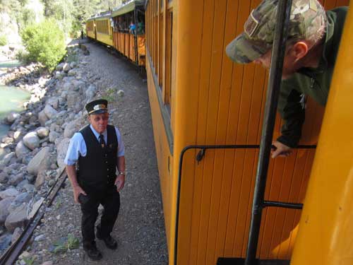 It takes five people to run a train: conductor, head brakeman, rear brakeman, engineer and fireman. There are also attendants in the concession and private cars.