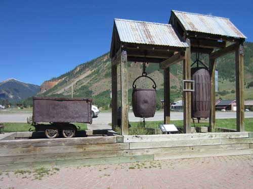 An ore cart and two shaft cans. The smaller can could hold about two tons of ore and required an electric- or steam-powered hoist to lift it out of the shaft.