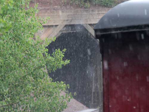 Thick, dark clouds had moved in and slight sprinkles quickly turned into heavy rain, leaving only the hardy (or foolish) in the open air car. Just before entering Mud Tunnel, however, it turned to fierce bouts of hail... covering the ground white! Fortunately it didn't last too long, and while it threatened again many times, it stayed dry for the rest of the trip.