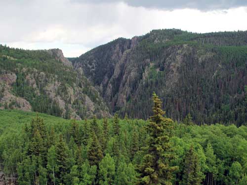 This multi-colored swatch through the Conejos Formation is known as the Calico Cut. Avalanches and mudslides cause many problems in winter and spring when the rocks are wet.