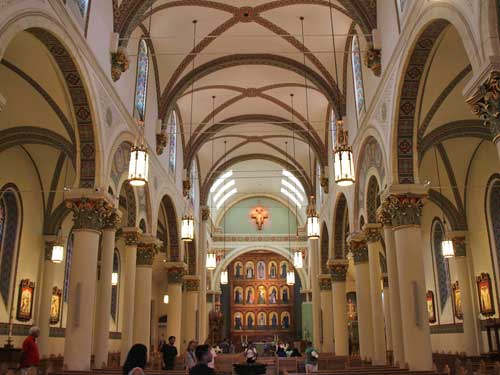 The Cathedral Basilica of St. Francis of Assisi (or more simply Saint Francis Cathedral) is a Roman Catholic church, built from 1869 - 1886 on the site of an older adobe church. It was designed in the Romanesque Revival style with round arches, Corinthian columns and square towers (originally planned to be topped with dramatic steeples but they ran out of money). It became a basilica in 2005.