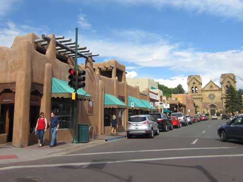 The Santa Fe Plaza (city square) is actually on the National Register of Historic Places. It's built in style of the old Spanish-American colonial cities with a large center green surrounded on all four sides by prominent buildings. The plaza has been the commercial, social and political center of the town since it was founded in 1610. The original plaza, however, was more of a fort surrounded by a large defensive wall.