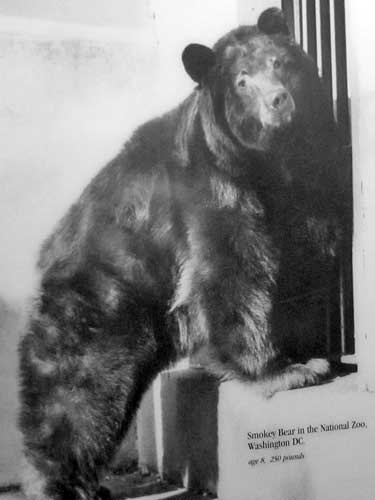 an American black bear cub was spotted dangerously close to the fire line. He was clinging to a tree and his paws and hind legs were badly burned. Fire crews rescued him and he was treated for several weeks for his burns. The tiny 2 1/2 month old, 5 pound cub was at first given the name of Hotfoot Teddy. But quickly it was decided to call him Smokey after the posters.