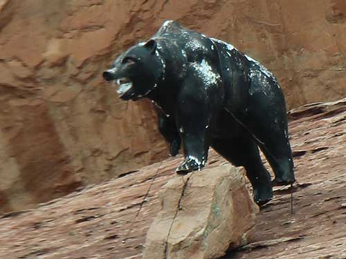 Statues of deer, bear and eagles make their home on a thick ledge.