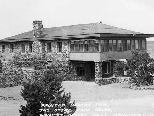 In 1924, Herbert David Lore registered his Painted Desert Inn under the Homestead Act. He had built it around 1919 using Native American labor and petrified wood and clay. It became known as the Stone Treehouse. Due to its isolation, there was no sewage or power lines, and water had to be hauled 8 miles from the Puerco River. Electricity was generated on site. To attract visitors, Lore cleared a small loop road and offered touring car treks. He also offered Navajo and Hopi artwork.