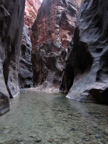 I walked over to the visitor center and caught the first shuttle of the day, at 6 am. There were three other people also headed my way. It was about a 40 minute ride to the end of the line.... the Temple of Sinawava (the Paiute's coyote god). The restrooms at the shuttle stop had been totally vandalized. Every last scrap of toilet paper had been ripped from the rolls, shredded and thrown about everywhere. Such a shame people feel the need to do these kinds of things.