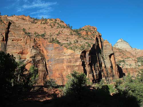 This is still the trail... cutting along a a shallow alcove with a seep at the back (obvious from all the green plants).