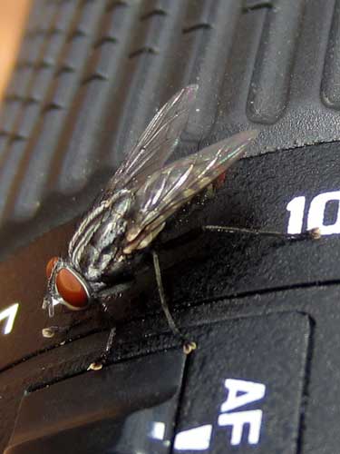 A Flesh Fly decides to take a short ride with my on my camera lens.