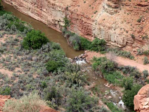 While there are beavers living in the river, the current is too swift for them to build dams. Instead they tend to hollow out dens in the river banks. As a result, while many of the cottonwoods show gnawing damage (as food), they are seldom cut down for building.