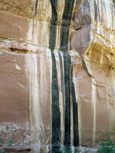 The black streaks are formed by water and organic material flowing over the sandstone during rain. White streaks indicate salt.