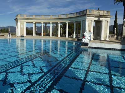 The Neptune Pool was built from 1924 to 1936. All told, there were three versions, each one being larger than the previous one. This final version measures 104 feet long by 58 feet wide (95 feet wide at the alcove). It ranges from 3.5 feet to 10 feet deep, and holds 345,000 gallons of water.