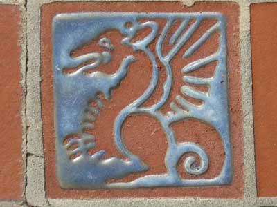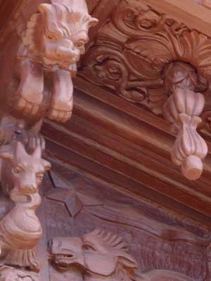 On the main door is a coat of arms. Above it is a hat called a galero with six tassels on each side. This was originally a pilgrim's hat like a sombrero. Its color and the number of tassels varied based on the rank of the cleric: red with 15 tassels was for cardinals, green with 10 tassels for archbishops, etc. This was probably for a bishop or an abbot, which has 6 tassels. Although it could just be because they thought it looked cool.