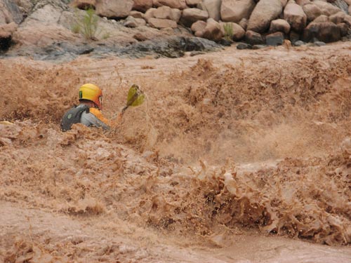 In 1997, a flash flood changed the rapid... making it even harder. It's now a series of five waves, each one bigger than the previous one, with the last one easily reaching 20 feet high. The flood also removed the 'cheat route' along the left side of the waves.
