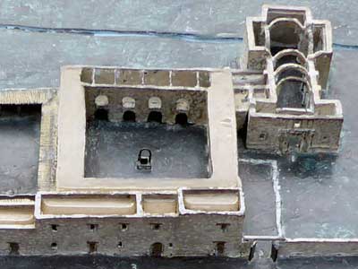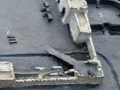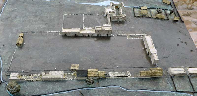 Located along the length of the Long Barrack were several bronze models, designed by George Nelson, of the Alamo over a 300-year history. They still retained some puddles from the previous rains.
