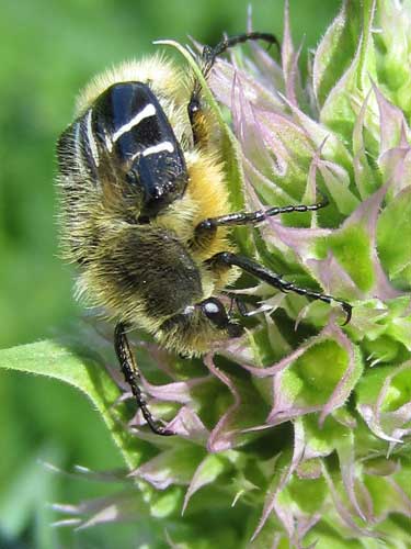 With just a very quick glance, this looks like a bumble bee. But look closer at the wings! This is a type of Bee Mimic Beetle or Flower Scarab Beetle (Trichiotinus affinis). It feeds on the sugar from stems, leaves, fruit and flowers of many different plants.