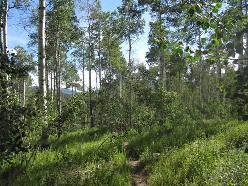 We dejectedly hiked back down to the aspen forest, near where we had had lunch. It was hard to find a spot to camp since it wasn't very flat... but this was really our only chance before heading down the steep hill all the way to the river. The flies and mosquitos were mildly annoying but not nearly as bad. We set up the tent in a field of tall columbine and fragrant mint (taller than us), surrounded by towering aspens and large rocks.