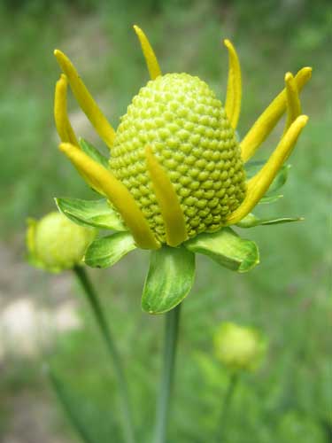 An early Yellow Coneflower. Eventually the long yellow petals will unfurl and the center will bloom (it is covered in 200 or more individual florets which are yellow-green in color).