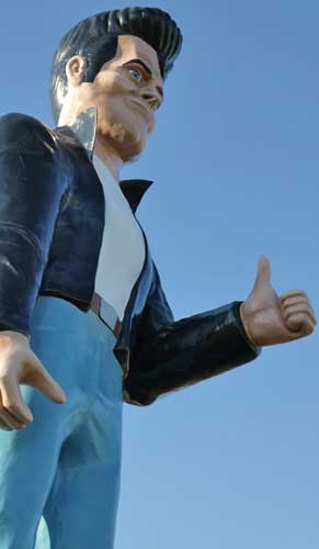 Big Charlie Jay in Hutchinson - The 1950s-style "greaser" stands on top of a 1948 Dodge farm truck near Hutch Vintage Market. He was made by Mark Cline in 2022.