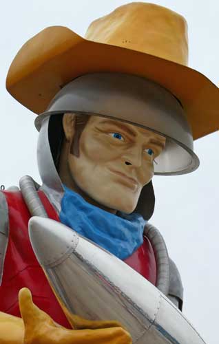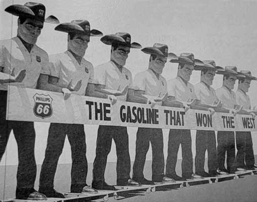 The Phillips 66 Cowboy was created as promotional attractions and placed in front of gas stations and various automotive shops. His hands were made to hold a giant muffler (hence the nickname of Muffler Man).
