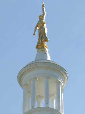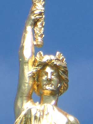 The large copper statues the crowns the building was made by William Clark Nobel (1858 - 1938). The building was completed in 1832 and originally capped by a cupola. When it was remodeled in 1909-10, this was replaced with a copper-clad dome... complete with statue. Sometimes known as Minerva, she stands 12 feet tall (15 feet including her pine-branch torch). She was built in several pieces that were brazed together with silver solder. It was then gilded in gold.