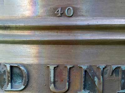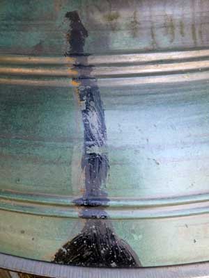 The copy has the same dimension, weight (2,080) pounds and inscription. Only the famous crack has been painted on, allowing the bell to still ring. It has an aged-oak yoke, iron straps and hand-forged bolts.