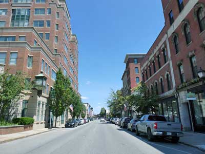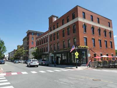 The street then and now. This building was constructed in 1880 to house the E. C. Allen Publishing Company. Mr. Allen then built a larger building across the street (demolished in 1987) that was connected by an underground tunnel.