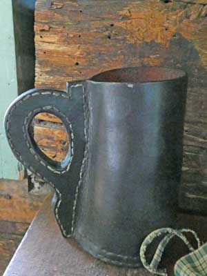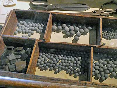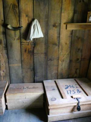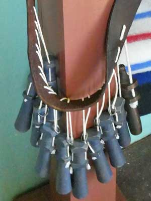 A closet with sample wares of the time. ... A belt with black powder paper cartridges. This was an upgrade from the old gun powder flask since each dose was pre-measured. Soldiers were required to have at least 4 teeth to be in the military, in order to rip open the powder packets.