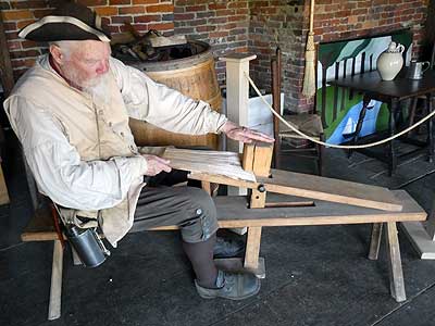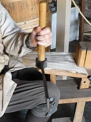 Casks came in different sizes, including hogsheads (up to 66 gallons) and port pipes (up to 172 gallons). They were easily moved by rolling. .... Greg demonstrated how to make a shingle on a shaving horse. Shingles could be traded for tobacco, cod, and other products from along the Atlantic coast (not England).