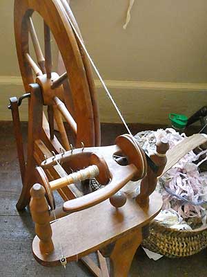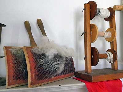 A spinning wheel ... Hackles and spools of yarn