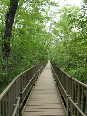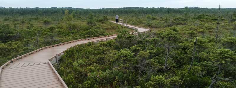 Covering 616 acres, the bog is a wetland. Wetland soils are completely saturated with water and only special plants can grow here. This bog is also special because it rests on a deep layer of peat. Peat is made up of the remains of mosses, leaves, seeds, branches and trees. During the early stages of decay, oxygen is used up faster than it can travel through the water-saturated soil. This prevents the matter from decomposing. Over time, this builds up, created peat. This peatland has acidic and infertile soil, resulting in dwarfed plant growth.