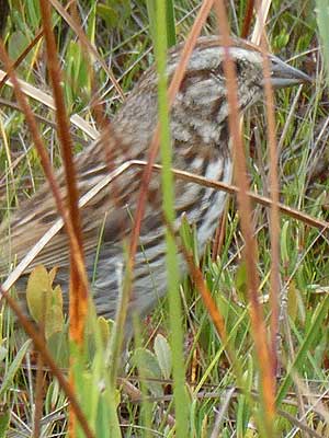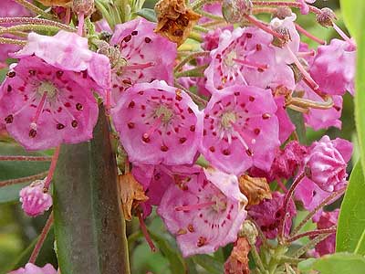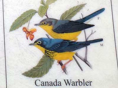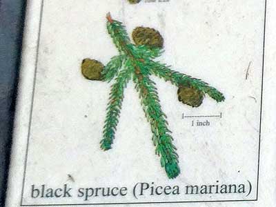 Sign 2 - Conifer wooded fen (green area)- While it was scarcely noticeable, we had apparently ascended a few inches up accumulated peat. But this is enough to make a big difference. Much of the water had drained off, allowing for different plants (and the animals that depend on them). Black spruce and tamarack (or larch, a deciduous conifer that loses its needles in the fall) thrive here. Red squirrels and voles replace the frogs and salamanders of the last area. The increased acidity in the soil is perfect for plants in the heath family, such as sheep laurel.
