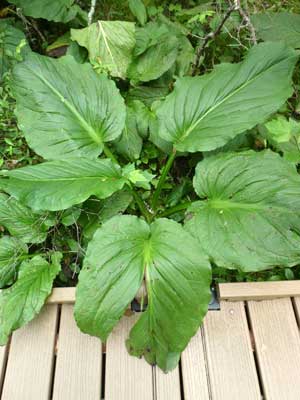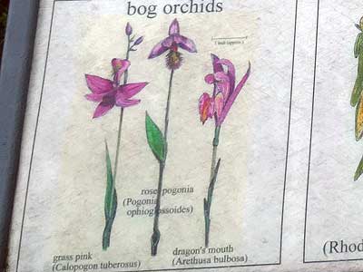 Sign 1 - Broadleaf deciduous forest with scattered evergreens (the orange area) - This area often acts as a shallow moat that carries water around the peatland. Along with red maples and black ash trees are northern white cedars and balsam firs. There are also ferns and skunk cabbage. Certain birds and animals are also specific to the region.