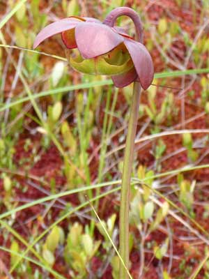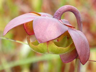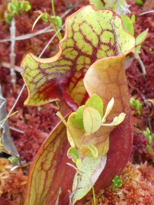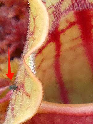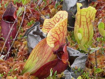 Pitcher plants catch insects and other small animals in their tubular, rain-filled leaves. A slippery inner surface and downward pointed hairs prevent them from escaping. After they drown, their bodies decay and are digested by the plant.
