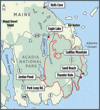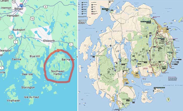 The arrow points to the town of Bar Harbor.