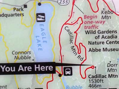 There was ample room to park in the large lot. We walked up the long set of stairs to the visitor building, grabbed a map of the park, talked with a ranger about various hiking trail options, then returned to the car. We then set out for Cadillac Summit where I had reserved us a timed entry of 10 am.