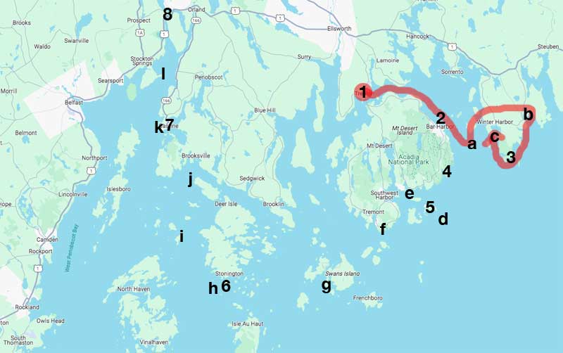 (1) airport, (2) Bar Harbor, (a) Egg Rock, (b) Prospect Harbor, (3) Rockefeller Hall, (c) Winter Harbor, (4) Sand Beach,