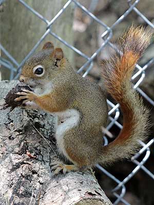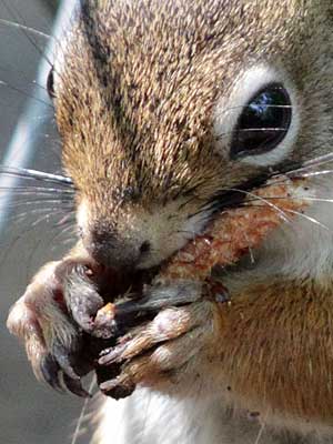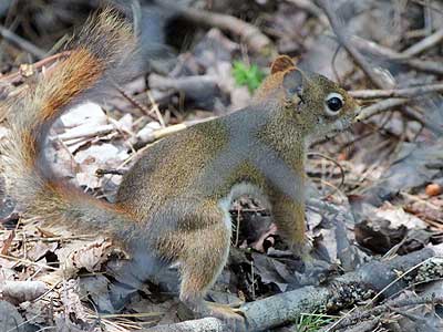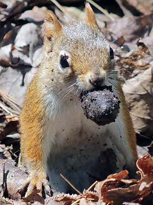 We watched a small squirrel for a while. After eating a small pine cone, it would race frantically across the ground, dive bomb into a hole hidden in the leaves, emerge with another pine cone, take it somewhere to eat it, then repeat the process. Several times!