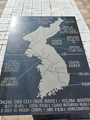 The Maine Korean War Memorial, built in 1995, lists the 233 Maine soldiers killed or missing in action in the war between North and South Korea.