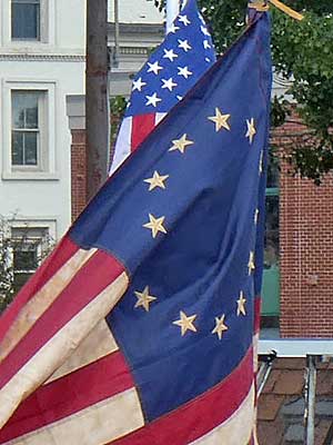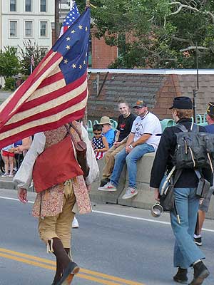 Historic military outfits (including a Civil War Union soldier in blue) and a Revolutionary War flag