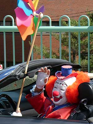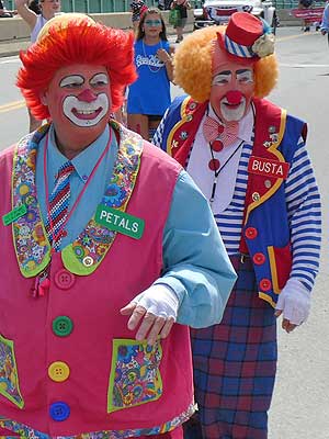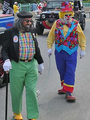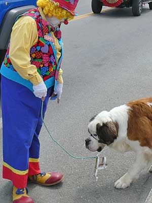 Clowns walking their invisible dog... making friends