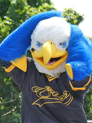 An eagle mascot almost loses his head in a sudden wind gust!