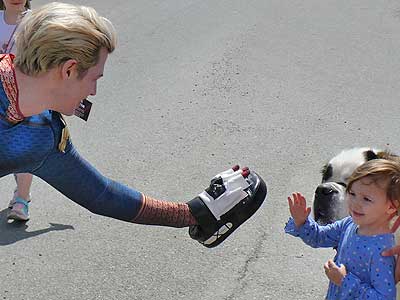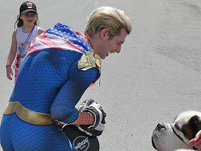 Homelander (wearing boxing training gloves) gets a high five.