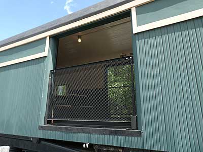 The Downeast Breeze open-air car #124 was built in 1964 as a flat car to transport pulpwood to the paper mills of Northern Maine. Known as Pulp Racks, these cars had V-shaped floors. In 1969, many of these cars were rebuilt with flat floors and used for transporting lumber. This car was modified to be a scenic passenger car with a shade canopy, bench seats and picnic tables by the Belfast and Moosehead Lake Railroad. It was purchased by the Downeast Scenic Railroad in 2008.