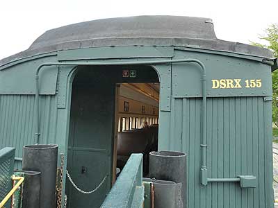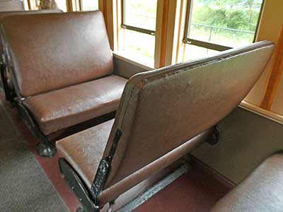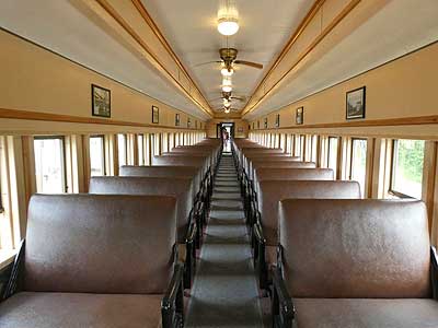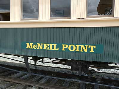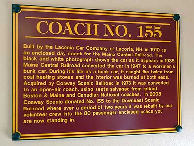 The McNeil Point passenger coach #155 was built in New Hampshire in 1910. The wooden, enclosed day coach was turned into a workmen's bunk car in 1947. It caught fire twice from overheated coal stoves, resulting in damage to the interior. In 1978, it was converted into an open-air car by the Conway Scenic Railroad. They removed all of the windows and installed seats salvaged from retired passenger coaches. In 2008, it came here. Volunteers spent two years rebuilding both the interior and exterior.