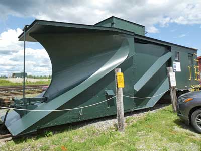 The Russell Snow Plow #82 was built in 1952 in Pennsylvania. After many years of service, it ceased operation in 2018. Restoration work has included fixing broken windows and doors and applying fresh paint. Further repairs will be adding lettering and restoring the interior and mechanical controls. In the background is the red Caboose #2608, built in 1926 in Pennsylvania. It was brought here in 2008.