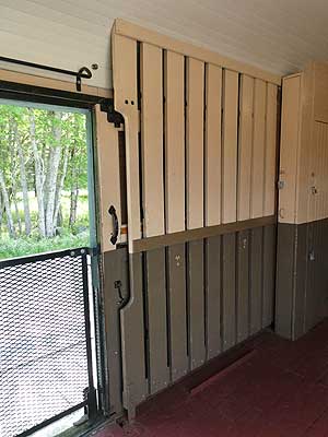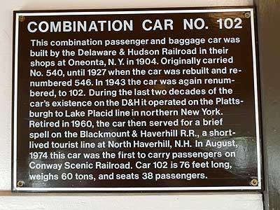 The Green Lake #102 car is a combination passenger and baggage car, built in New York in 1904. It was #540 until 1927 when it was rebuilt and renumbered to #546. In 1943, it became #102 and used on the Plattsburgh to Lake Placid Line in northern New York. In 1974, it became the first car to carry passengers on the Conway Scenic Railroad at Conway. In 2008, it arrived here and was completely rebuilt, including a new maple ceiling and walls.