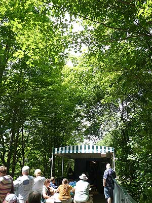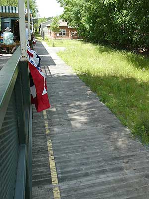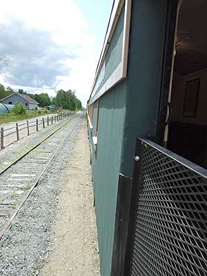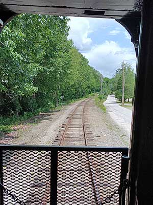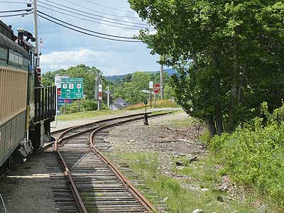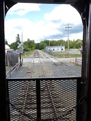 At Hannah Way, the track split. The locomotive uncoupled from the front of the train and passed by us on a siding, heading to the rear. This was done so that it would be able to push us over the upcoming bridge instead of pull us over.