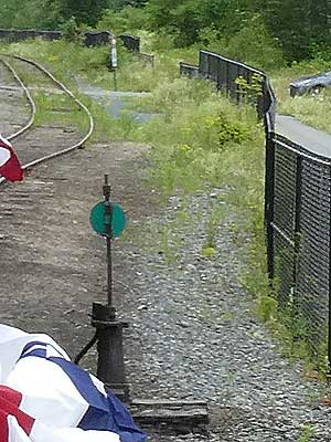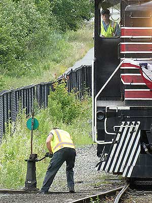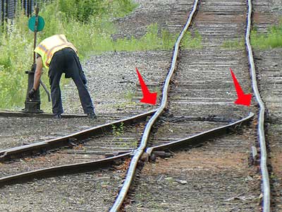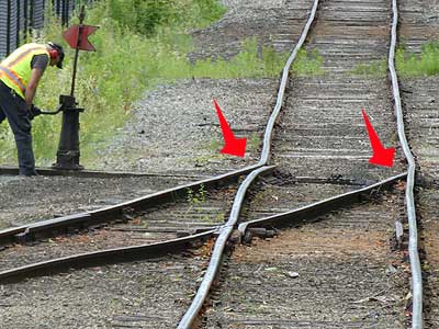 A brakeman changes the track that the locomotive will go on, which also turns the indicator sign from a green circle to the red arrow.